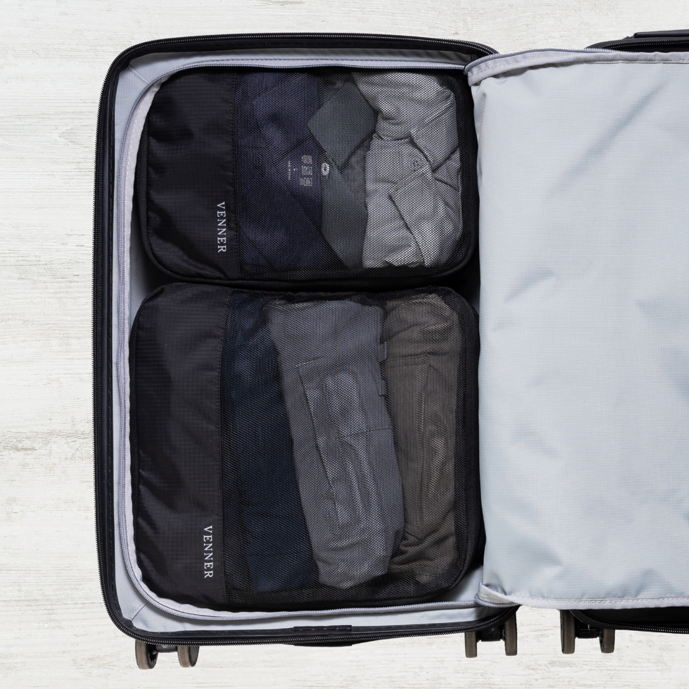 Yes. Each cube features a compression zipper that reduces bulk once packed, helping you save space and keep your luggage more organized.