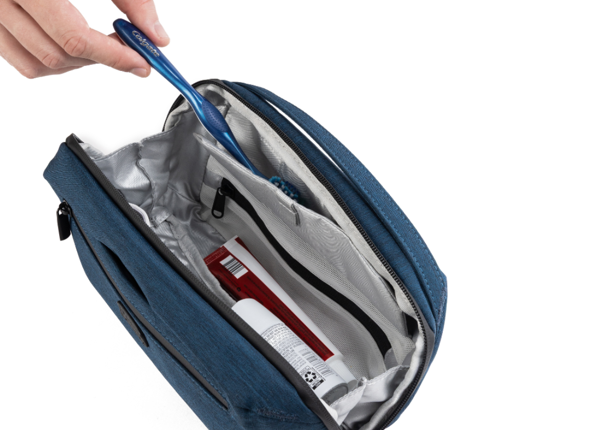 A dedicated slim compartment with a discreet magnetic closure keeps your toothbrush secure, separated, and hygienically stored throughout your trip.