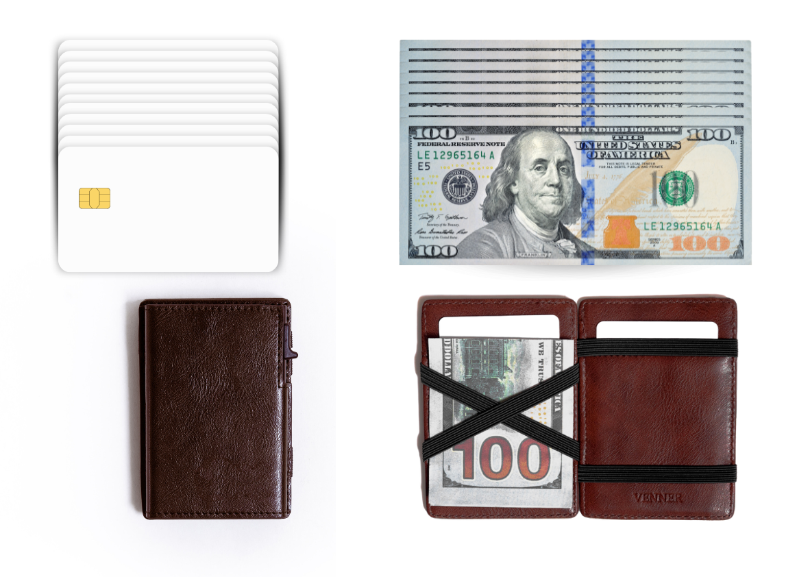 With the lever to lift the cards just like the Switch Wallet and the elastics to magically store the bills, the Venner Wallet is the revolution in wallets.