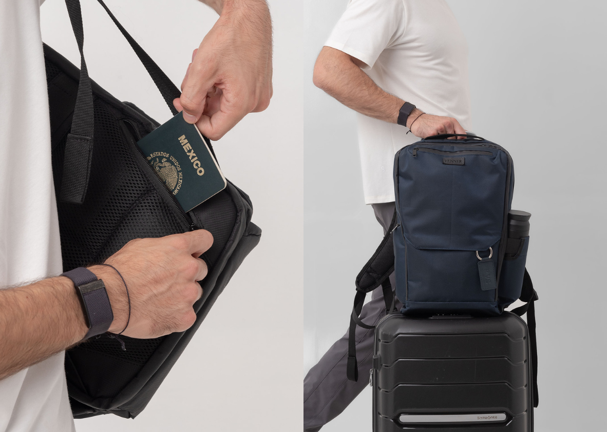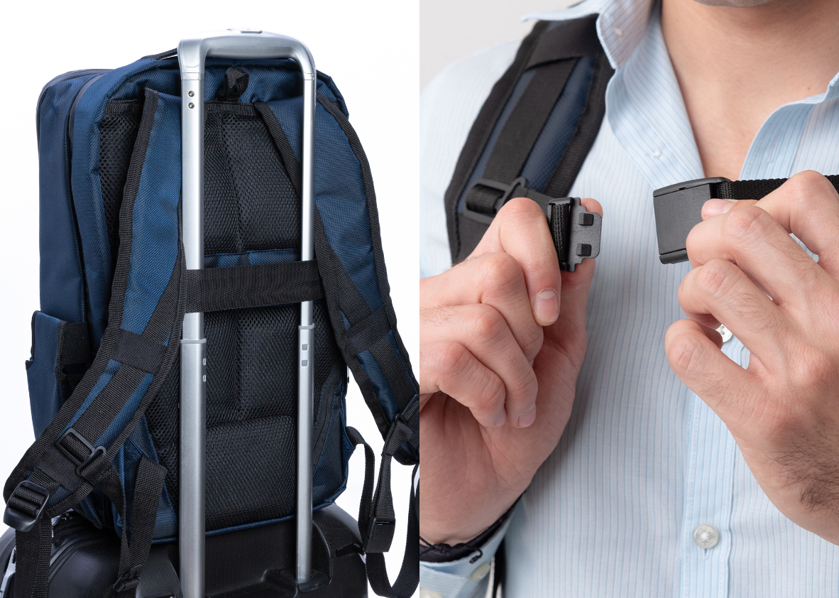 We worked to design the perfect size so that it is a comfortable backpack for everyday use and you can also take it on a trip. It has compartments for AirTag, passport holder and more items that you usually take on a trip. It also has carry-on luggage strap, so you can travel comfortably with it.